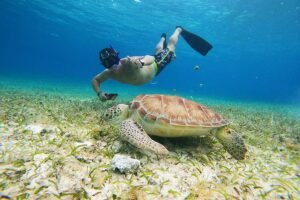 Explore el santuario submarino de Cozumel, uno de los refugios más importantes del Caribe para la tortuga Verde y la tortuga Carey. Este tour en lancha se dirige a zonas de alimentación protegidas dentro del Parque Nacional, donde los extensos pastizales marinos permiten observar a estos ejemplares en su hábitat natural. Podrá nadar en aguas turquesas de visibilidad excepcional para apreciar el nado y comportamiento de las tortugas en total libertad, bajo protocolos de respeto ambiental que garantizan una experiencia auténtica y responsable.