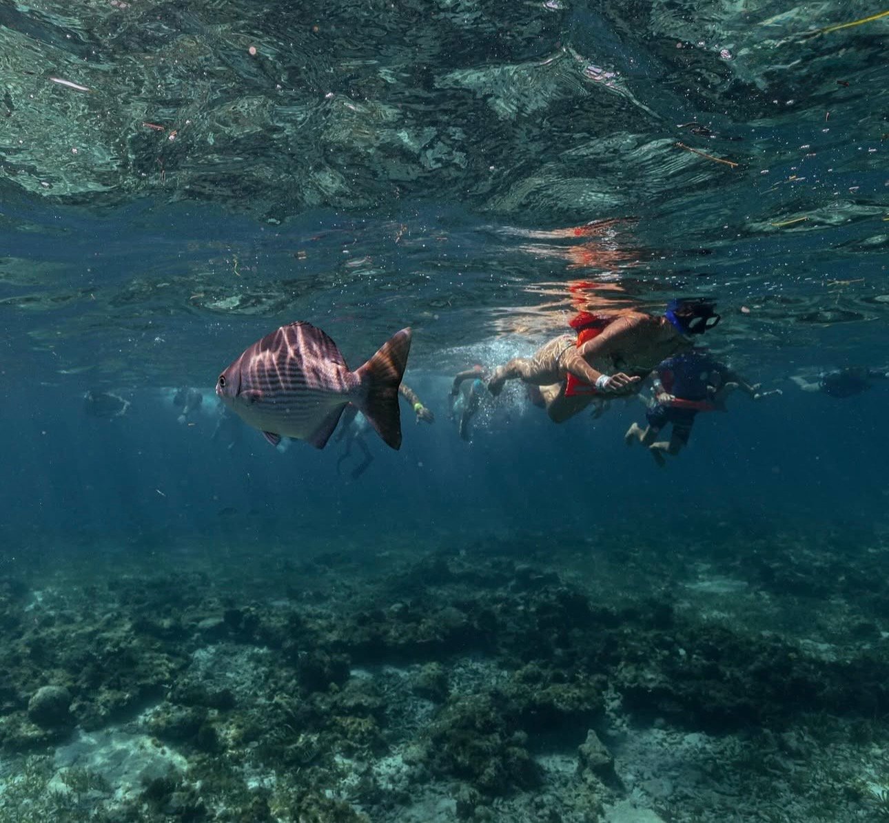 Un tour dinámico que combina lo mejor de dos mundos: la mística de una galería sumergida y la belleza salvaje del Caribe. La profundidad es baja (entre 3 y 9 metros), lo que permite apreciar los detalles de las esculturas claramente desde la superficie. La visibilidad suele ser excelente, permitiendo ver peces ángel, langostas y, con suerte, tortugas marinas en el arrecife.